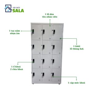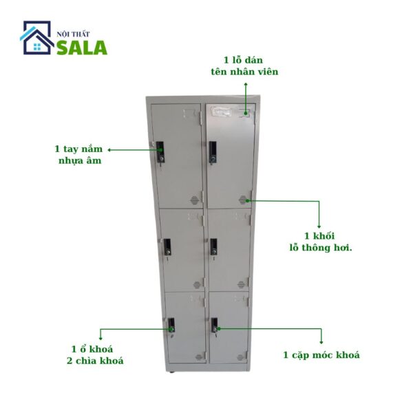 – Tủ có phụ kiện gồm có 1 tay nắm nhựa âm, 1 ổ khoá với 2 chìa khoá, 1 cặp móc khoá phụ, 1 lỗ dán tên nhân viên, 1 khối lỗ thông hơi.